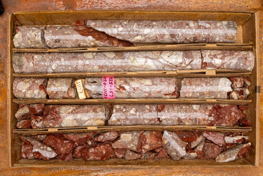 PC25-136 core showing the calcite-cemented quartz vein breccia with yellow quartz clast