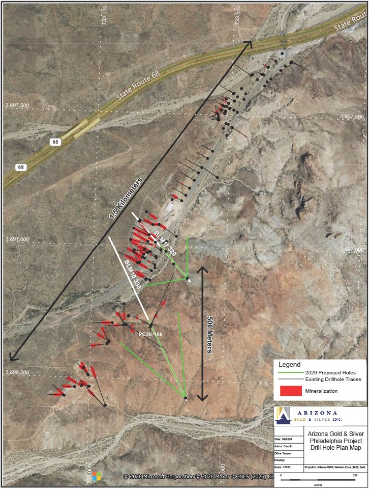 Land Status and Permitting The unpatented lode mining claims are located on BLM-administered public lands. An introductory meeting was held with the local BLM office in Kingman, Arizona where the BLM was introduced to the Company’s presence and the Company’s plans to do an initial drill test for the continuity of high grade northward from the old production stope towards the Philadelphia#1 shaft. Surface disturbance will be minimal (<0.1 acres), which falls well within the 5-acre exclusion for a Notice of Intent permit. An initial Notice of Intent will be filed with the BLM before the end of February with the expectation that we will have a permit to drill and reclamation bond in place with the BLM by early April, Arizona Department of Water Quality permits in place, and a drilling contractor lined up by mid-April.